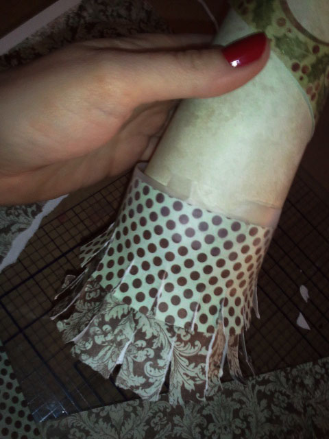 Cut strips out of the different patterned papers. I started with about 2" strips, but as I moved up the tree, I found it easier to work with 1" strips. Take your first strip and make small tears along one end of the paper. I made the tears about a .25" apart. If you want a cleaner look, you can cut the strips rather then tearing them, but I like the torn look better.